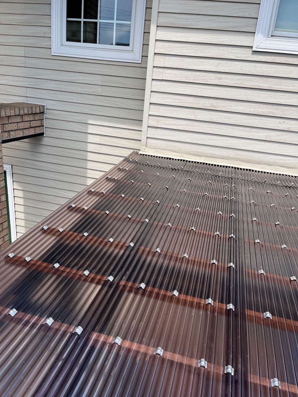 新しい波板を張り替えたことで、テラス全体が明るく、開放感のある空間になりました。ポリカーボネート波板は透光率が高く、日中は自然光がしっかり入るため、室内や洗濯物干し場も快適になります。また、強度も高いため、台風や突風にも強く安心です。