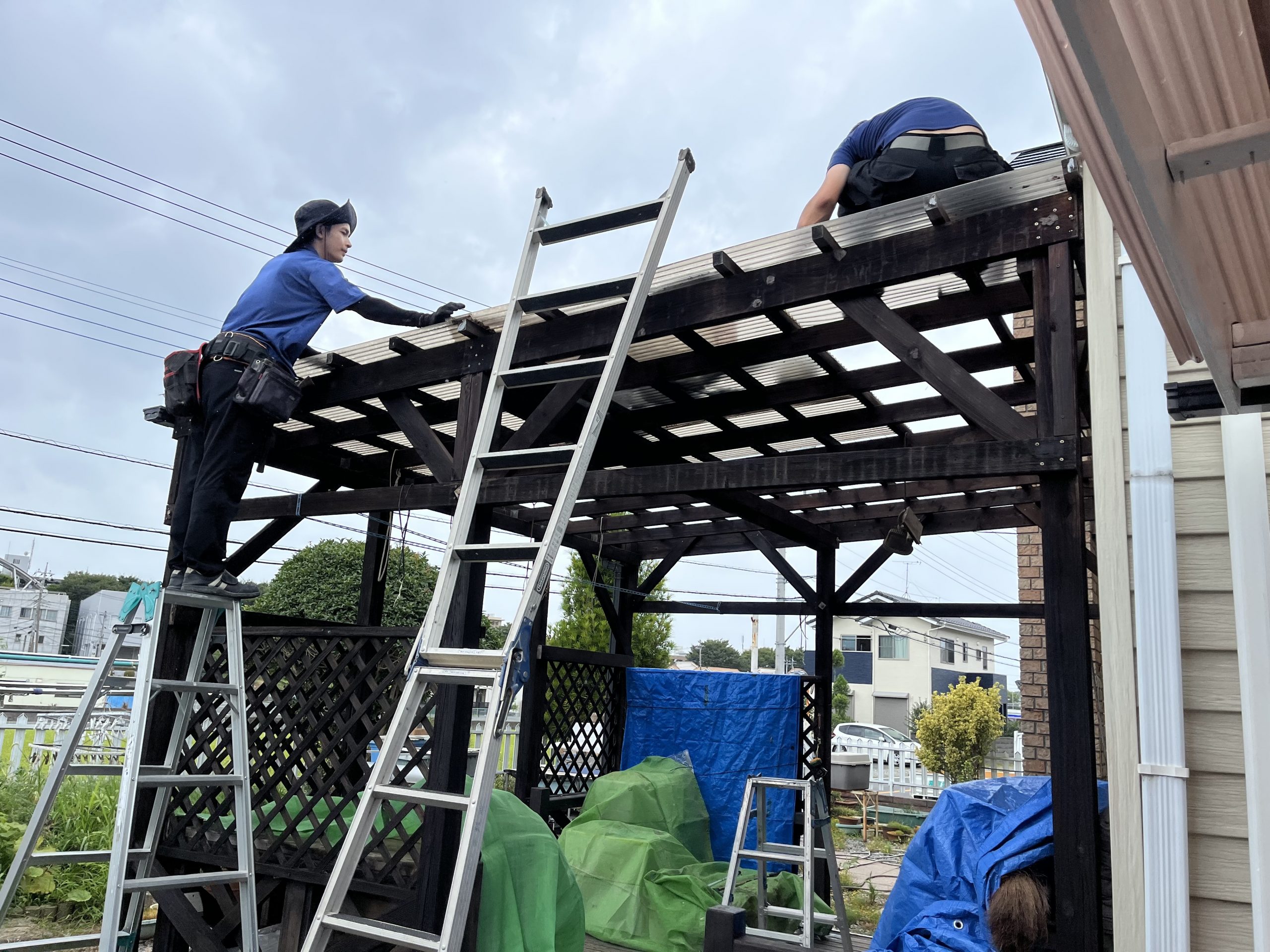 こちらは工事前のテラスの写真です。長年使用していた波板は、色あせや汚れ、そして一部にたわみが見られました。紫外線や雨風の影響で劣化しやすく、割れやすい状態になることもあります。お客様からは「暗く感じるようになった」「強風で飛んでしまわないか心配」とのご相談をいただき、今回交換工事を行うことになりました。